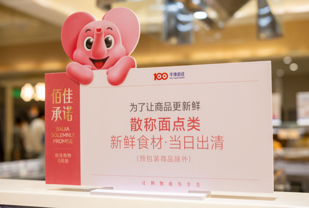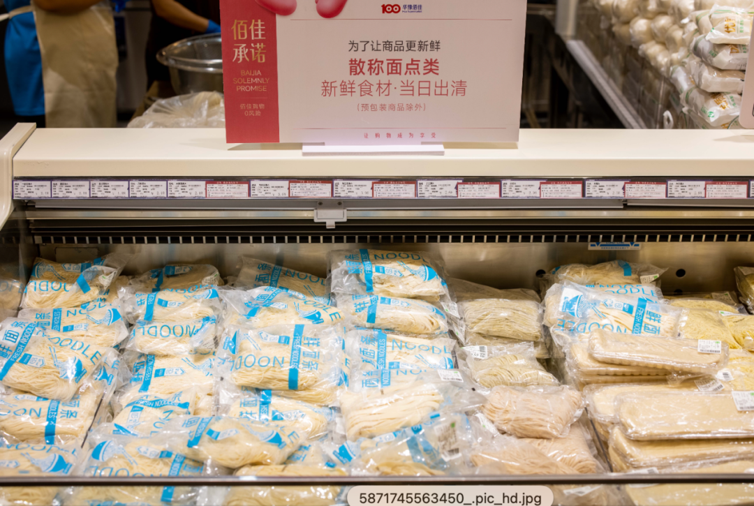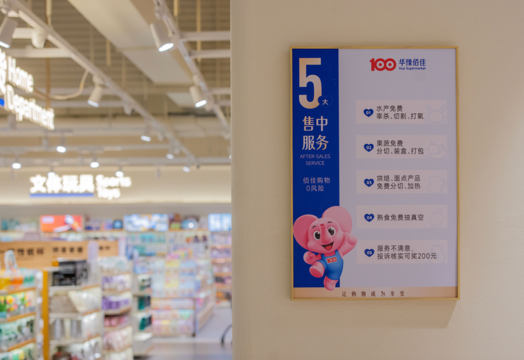 華豫佰佳超市漯河店面積6000平方米,上架了12000支左右SKU,配備員工約155人。規(guī)劃分區(qū)包括賣場(chǎng)入口的禮品區(qū)、名煙名酒區(qū)、顧客服務(wù)區(qū),以及內(nèi)部的精品果蔬、熟食、烘焙、面點(diǎn)、鮮肉、水產(chǎn)、低溫冷藏品、米面糧油、休閑食品、清潔用品、日用百貨等分區(qū)。