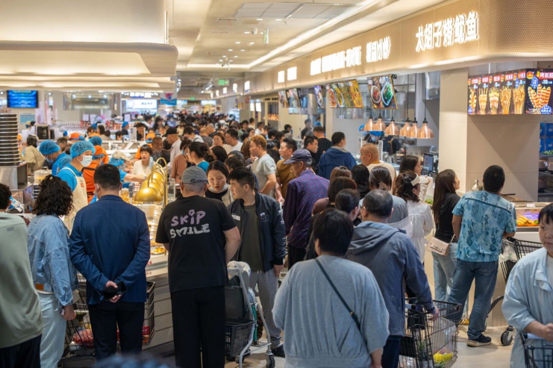 開(kāi)業(yè)當(dāng)天,超市人氣異?;鸨?,放眼看去全是“人從眾”,各個(gè)區(qū)域都有顧客推著購(gòu)物車在挑選商品。