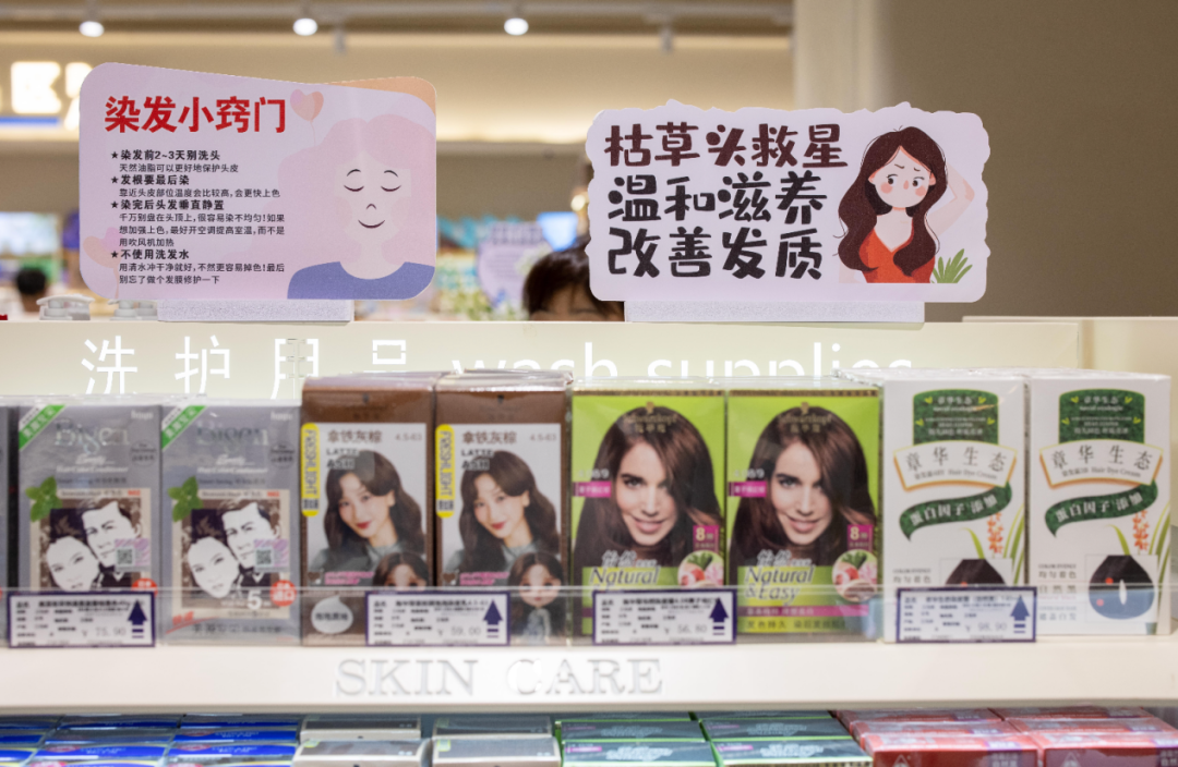 ▲美妝區(qū)從大牌名品到平價(jià)好物應(yīng)有盡有!貨架上放著各種貼心小貼士牌,教您分辨膚質(zhì)、發(fā)質(zhì)等,挑選適合的產(chǎn)品。